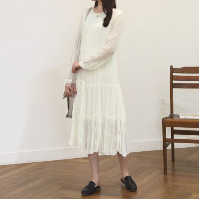러블리즈 쉬폰 롱원피스 빈티지한 느낌의 주름 롱 원피스를 소개해드릴게요 여유있게 일자로 떨어지는 핏으로 바디라인이 부각되지 않아 부담이 없구요 스커트 부분에 3단 셔링으로 더욱 로맨틱한 무드를 연출해줘요 하늘거리는 가벼운 느낌에 살짝 주름진 소재감이 입체적인 느낌을 주어 밋밋한 디자인에 포인트를 선사해주어요밝은 컬러지만 안감이 있어 비침없이 안정감 있게 착용 가능하며 봄, 가을, 겨울등 다양한 시즌에 입기 좋아요 단독으로 입기에도 좋고 레이어드해서 입기도 좋은 활용만점 제품이랍니다 / ivory