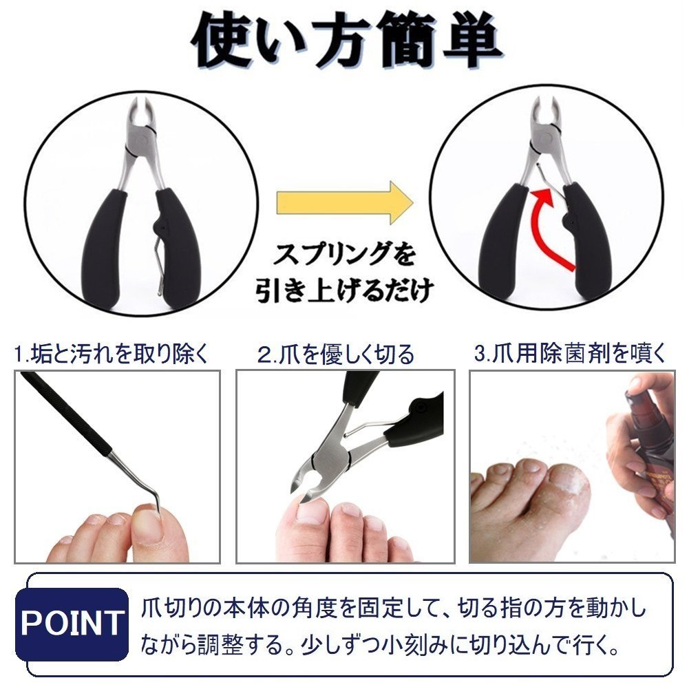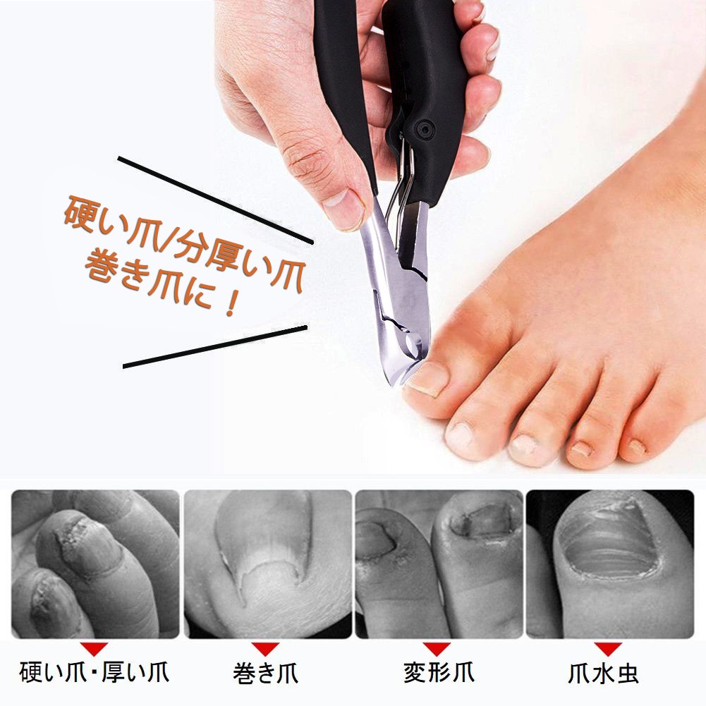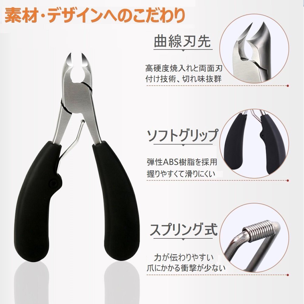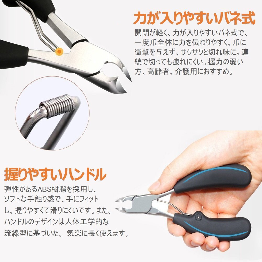 ♥【硬い爪・巻き爪・分厚い爪カットに】ニッパーとスプリングの弾性効果により、通常の平型タイプと比べて、爪に衝撃を与えず、軽い力で切ることが可能です。爪に合わせた曲線の刃先は、爪の端など細かい箇所にも切り込んでいけるため、手の爪はもちろん、足爪のネイルケア、巻爪やお年寄りのような厄介な硬い爪、二枚爪、割れやすい爪、爪囲炎、爪水虫による分厚い爪でも安心してご使用いただけます。