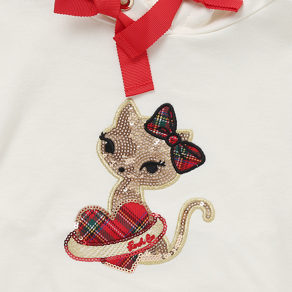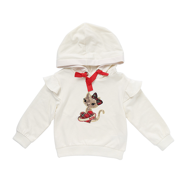 상품설명 아이보리 컬러에 맨투맨 티셔츠로 후드가 붙어있으며, 후드에 레드 테잎이 멋스럽습니다. 어깨에 프릴과 가슴에 고양이 포인트가 러블리하며,데님팬츠,스커트등 어떠한 하의와 코디하셔도 잘어울립니다.