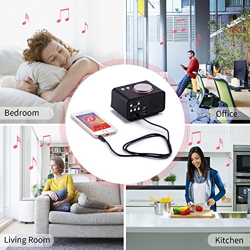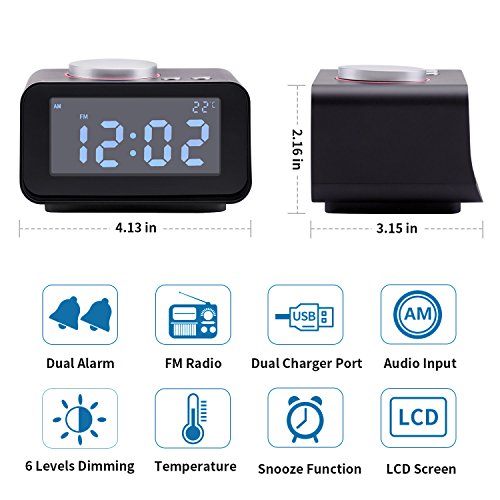 It is not just an alarm, it represents a cozy lifestyle. Everyday you wake up with tone or your favourite radio. When you wake up, you connect the clock with your phone, and start mp3 mode, then you finally start your day. Time Display Brightness Adjustment The adjustable dimmer enables you to set the time display to a brighter setting in daytime and softer one at night which are 6 levels of LCD dimming control. Dual Alarm Can set two different alarms with individual wake to Ringtone and Radio sound.Wake you at different times or set one alarm for weekdays and the other for weekends. FM Radio Play The clock has strong reception and clear sound. Memory up to 20 Programmable Radio Stations.You can quickly access your favorite radio station. AUX IN Speaker Listen to your favorite music using your iPhone, iPad, or Android device through the 3.5mm AUX audio input. Snooze Function To counter oversleeping, the alarm clock has a snooze feature. Should the alarm ring and you wish to continue sleeping a bit longer,simply press the Rotary button once and go back to sleep. Specification: Dimensions: 16*9*18cm Input Voltage:100-240V Input Freuency: 50/60HZ Output Voltage: 5V Output Current: 2A Package Including: 1 x Alarm Clock 1 x Aux-in Cable 1 x Power Adaptor 1 x Operation Instructions Note: 1.LCD dimmer and time setting cannot be adjust in FM and AUX mode. 2.If this clock is powered by battery, it is just a alarm clock and indoor thermometer.Feature