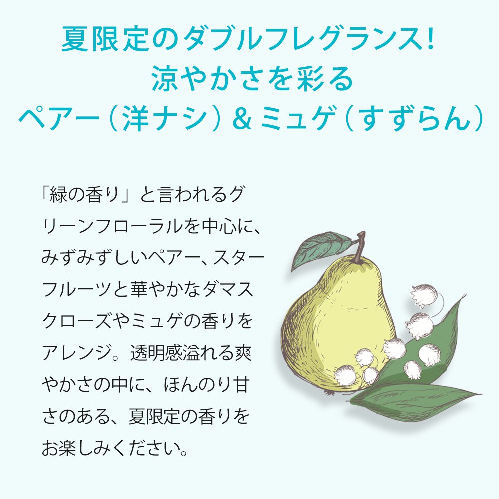 「緑の香り」と言われるグリーンフローラルを中心に、みずみずしいペアー、スターフルーツと華やかなダマスクローズやミュゲの香りをアレンジ。透明感溢れる爽やかさの中に、ほんのり甘さのある、夏限定の香りをお楽しみください。