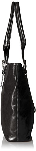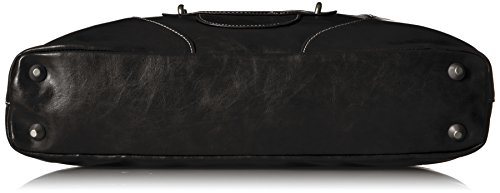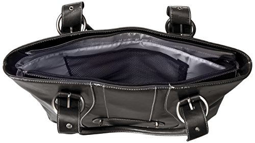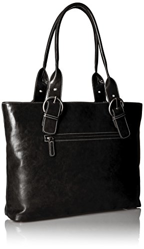 Dressy antiqued finish leatherette. Shinny nickel hardware. Full top zip closure. Exterior zip pocket. Rolled shoulder straps. Interior padded laptop divider. Organization interior wall w/ large mesh pocket.