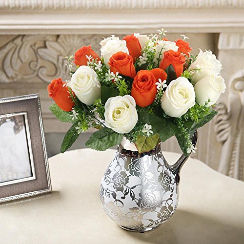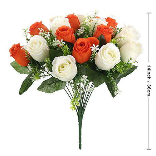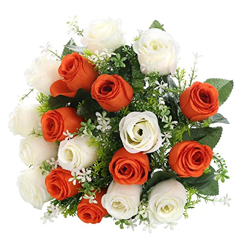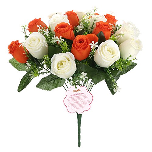 Silk Rose Buds Bouquet White + Orange 18 heads SOLEDI Artificial Fake Flower Bunch Bridal Bouquet Wedding Living Room Table Home Garden Decoration