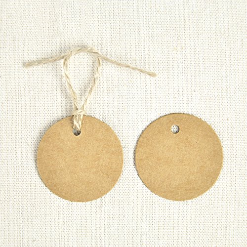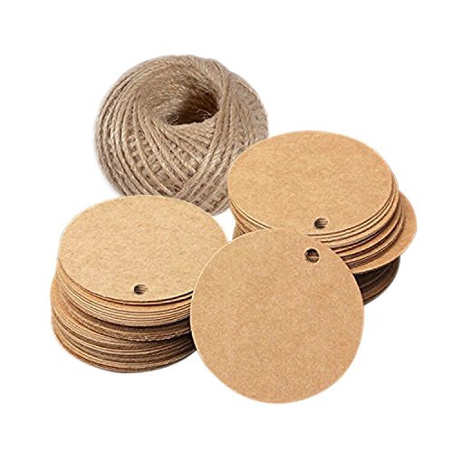 G2PLUS Kraft Paper Gift Tag with 100 Feet Jute Twine, Round Shaped 5.5 CM Blank Hang Tags for Craft Projects, Xmas Gifts (Brown)