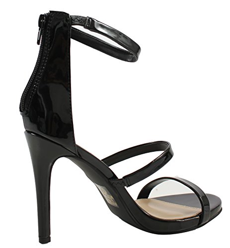 Product DescriptionTriple strappy construction featuring patent faux leather with rear zipper for easy on/off, and high heels approx 4". ( size 7 measurements)0