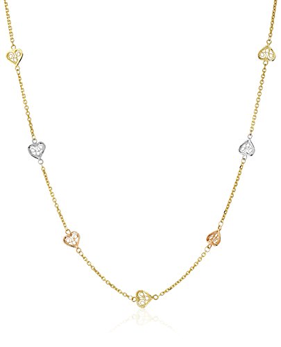 -. Title : 14k Gold Tri-Color Filigree Heart Station Necklace, 18"