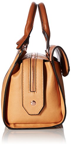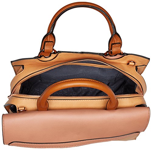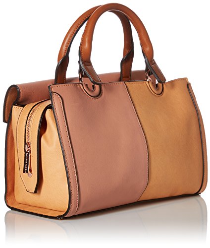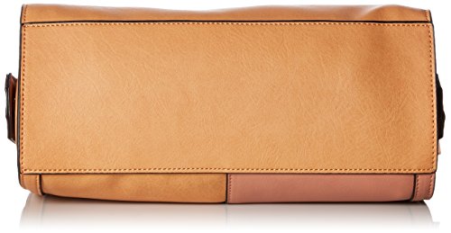 Mod-inspired satchel features an elongated silhouette with color block styling and a removable shoulder strap.