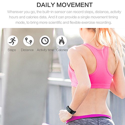 STEPS--All day track step counting, distance tracking, calorie tracker; Sleep monitor: sleeping time, sleeping quality, alarm clock and etc; Incoming call notice, remote camera, remote video, find phone, lost warning, out of range alarm. TIPS: The tracker will start to show the your steps data after your first 10 steps; 30 steps or above will be recorded by the tracker and the APP => APP cannot get sync if you did not connect the device successfully.
