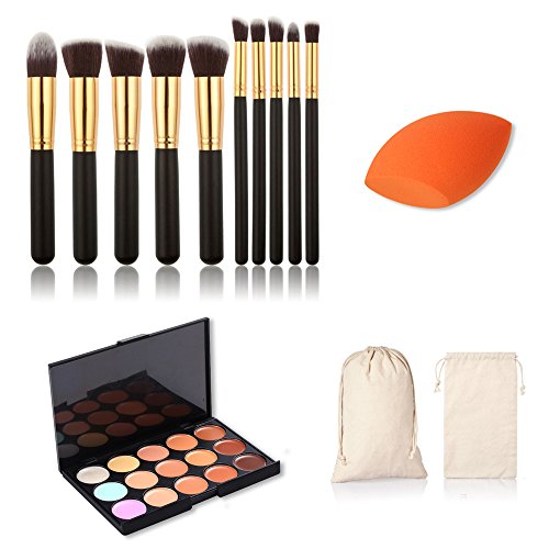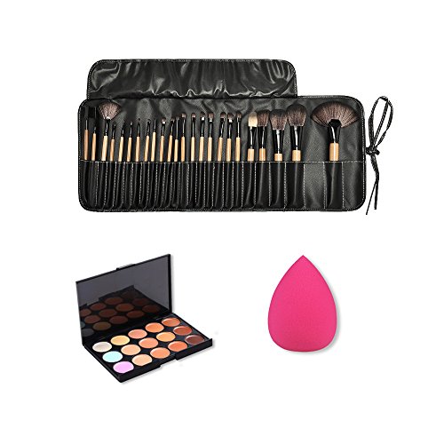 Package list: 24pcs Wood Color Makeup Brush Set, 15 Colors Camouflage Concealer Palette, 1pc Water Drop Makeup Sponge