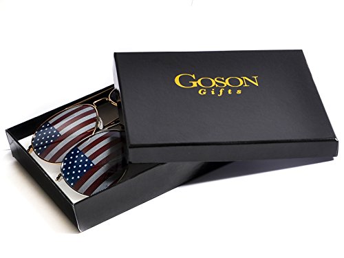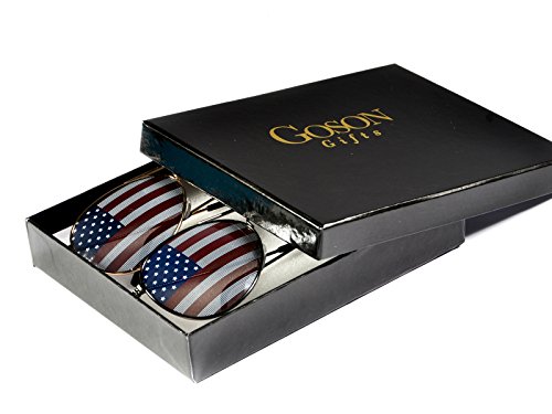 -. Brand : Goson -. Department : mens -. Feature : RECOMMEND FACE SHAPE: Oval, Heart, Square / BRIDGE/TEMPLE SIZE: 14MM/135MM / Comes with Gift glasses box and 60 days warranty. -. ProductGroup : Apparel -. ProductTypeName : EYEWEAR -. Title : Goson® American Flag Mirror Aviator Sunglasses