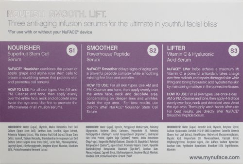 NuFACE Anti-Aging Infusion Serum Trio is the perfect introduction to the NuFACE serums. In one convenient sampler set, experience the dramatic results of all three serums: Nourisher, a superfruit stem cell serum, promotes the effectiveness of all Infusion Serums and repairs, nourishes and protects the skin using breakthrough stem cell technology; Smoother, a powerhouse peptide complex, smoothes fine lines and wrinkles and slows the aging process with a concentrated complex of 6 powerful anti-aging peptides; Lifter, with vitamin C and hyaluronic acid, helps achieve maximum lift and brightening. Includes: NuFACE Nourisher (S1) - combines the power of apple, grape and alpine rose stem cells to create a deeply nourishing serum that protects skin cells, reduces inflammation and promotes cell renewal, NuFACE Smoother (S2) - combines six powerful peptides to deliver instant wrinkle reduction results and NuFACE Lifter (S3) - helps achieve a maximum lift and hydration with vitamin C (a powerful antioxidant), and hyaluronic acid (a moisture sponge).