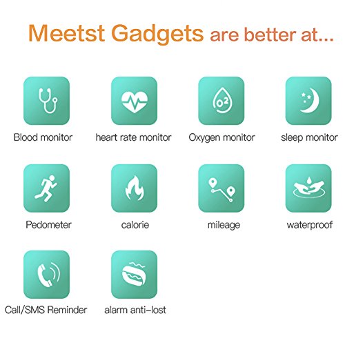 -. Feature : ✔【Sleep Monitor 】: Please wear the tracker when you are sleeping, and turn on the Bluetooth of your phone as well. Fitness tracker will automatically record your sleep data, and you need manually refresh the APP to get the updated data every day, the fitness tracker can't save your data, please update your data, so that the APP will save your data in your smart phone. / ✔【Easy to Charge 】: Rechargeable & Long-lasting battery, about10-15 Standby time/ 7 days Using time. Please charge it before running out of battery. 1.5 hours charging time is enough, do not charge it overnight. / ✔【HOW TO BIND? 】: When you first use, please take a full charge let the screen will activate, then download the APP "Wearfit " (Scan the QR code on the manual or download "Wearfit" in Apple Store or Google Play, also enable to iPhone Health, Google fit, for Bluetooth 4.4, iOS 8.0 / Android 4.4 or above.). When your Bluetooth is turned on, please bind your smart bracelet at APP "Wearfit". / ✔【Multi-Function】: The device will automatically to measures the present blood oxygen (non-medical), blood pressure, heart rate (Not for medical purpose), sleeping monitor, calories burned, pedometer, stopwatch, step counting, distance tracking, shake to take photo, find phone,Intelligent notification be clear at a glance, Call, SMS, Facebook, Twitter, and all kinds of social information. Sedentary reminder, remind you to leave the seat for just the right amount of exercise. / ✔【100% MONEY BACK GUARANTEE】: Meetest Gadgets offer good customer service and long time warranty, any question or problem, please contact us. We're SO confident that you will love this smart watch that it's backed by our 100% Money Back Guarantee. If you don't love it for whatever reason, we'll replace it or give you every cent back. That means that you either love it, or it is free!