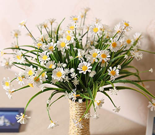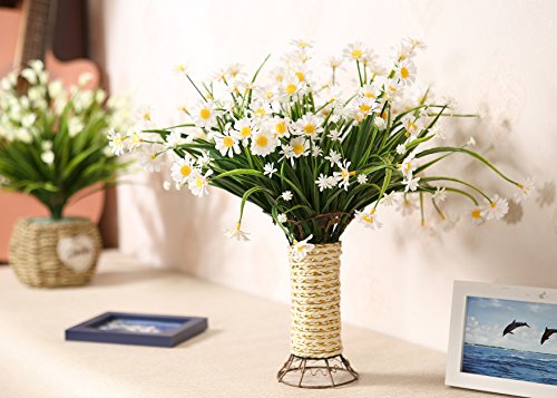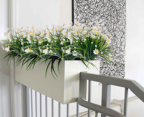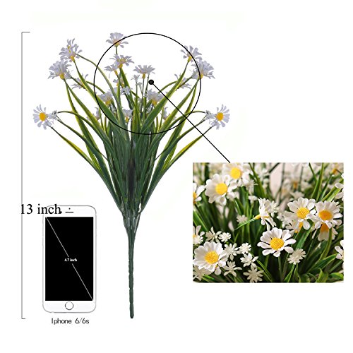 ◆【Family Leisure Time】: • Artificial Daisy Flower Excellent Material Let you experience the joy of relaxing in the ideal Home. • All faux daisy flowers are handmade 100% SAFE with love and care by Nepalese or women in remote area , with each purchase you are contributing to their livelihood and better life. ◆【Perfect Decoration】: ★★★ {One square foot outdoor requires 3-4 Branches of flowers to fill} •These branches will light up any occasion---Add greenery to home. •Plastic plants is uv resistant and never fade, can be put outside,windowsill, front porch, back deck, garden, veranda, balcony. •Make your walkway, pathway, staircase standout by bordering our beautiful blooming daisy flowers,create an illusion of enlarged space ◆【Easy to Use】:•Artificial green plant outdoor which is constructed of plastic and fabric material.•This faux daisy flowers can be a nice decoration for a long time,perfect for people who do not have the experience of planting. ◆【Package Content】: • Artificial Plastic Eucalyptus bushes as picture show ☞ 4 Bunches ☜, 7 stems each bunch,Each bouquet has 7 flexible stems and bushy leaves daisy flowers. [Pot NOT included] • Material: Harmless 100% SAFE ,ECO-Friendly Plastic,Fabric • Type: Faux Plant Length:12.99 inch Bushes • Color: Green bushes and white daisy flowers . ◆【Attentions】: •Because of packing,the fake daisy flowers would be agminated when you get it. •Need to move them with yor hand,you can adjust each daisy flower as your pleases.Feature