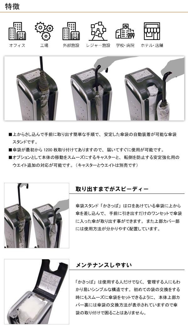 上からさし込んで手前に取り出す簡単な手順で、安定した傘袋の自動装着が可能な傘袋スタンド。傘袋が最初から1200枚取り付けてありますので、届いてすぐに使用が可能です。スリムなデザインで、商品の上部には使用方法がわかりやすく記載されています。 |