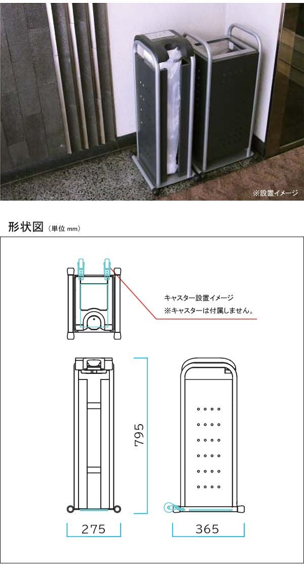 | 仕様 | 傘袋1200枚収納可 対応傘袋:スペア袋(238-4010) 無鉛化対策品(質量に対する鉛含有0.1wt%以下) 再生材使用 屋内用 転倒防止ウエイト・キャスター対応(ともに別売です) 商標登録済(登録第5214870号) 完成品 |