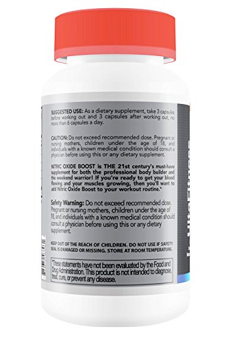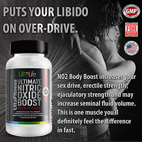 -. Feature : Ultimate Nitric Oxide Booster + L. Arginine works like Rocket Fuel for your Workout! Explodes Muscle Growth, Increases Strength, Reduces Recovery Time and Maximizes Endurance--In and out of the Gym! / Nitric Oxide is a key molecule that expands your blood vessels--which leads to increased oxygen and increased blood flow to critical areas of your body delivering REAL RESULTS(from the weight bench to the bedroom) / L Arginine Boosts Nitric Oxide Production For Fast Muscle Building, A Healthy Heart, Good Blood Pressure and Fast Muscle Growth-- significant gains of lean muscle mass should be expected. / PUTS YOUR LIBIDO ON OVER-DRIVE. NO2 Body Boost increases your sex drive, erectile strength, ejaculatory strength and may increase seminal fluid volume. This is one muscle you'll definitely feel the difference in fast. / EXPERIENCE THE POWER OF THE PUMP. Nitric Oxide Boost works on your muscles and your mood--You'll notice the feeling of Fuller, Pumped Muscles and Overall Feeling of Well-Being that Last Long After Your Workout is Done.