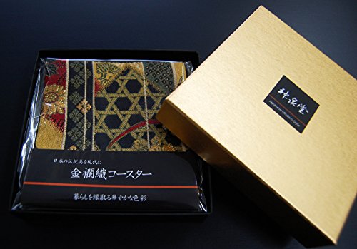 -. Feature : 金襴織物で作られた帯風で豪華な和風コースターです。 / 素材:表面金襴部分 ポリエステル100% 裏面黒無地 綿100% / 生地の取り都合で1枚ごとに多少柄が違います。 / サイズ:約10×10cm 5枚セット 化粧箱入 / 日本製