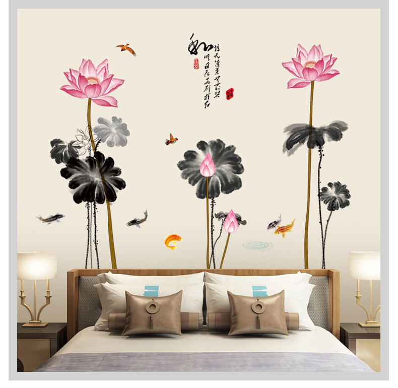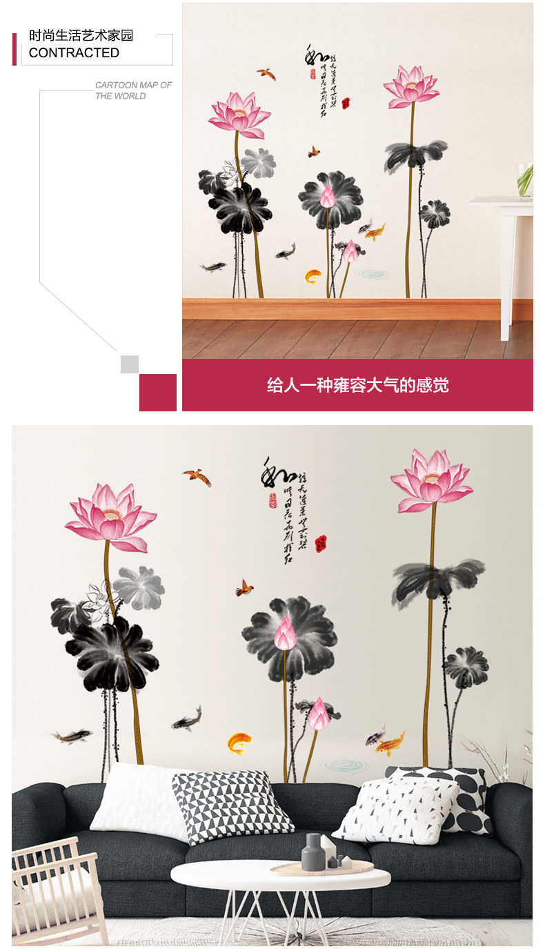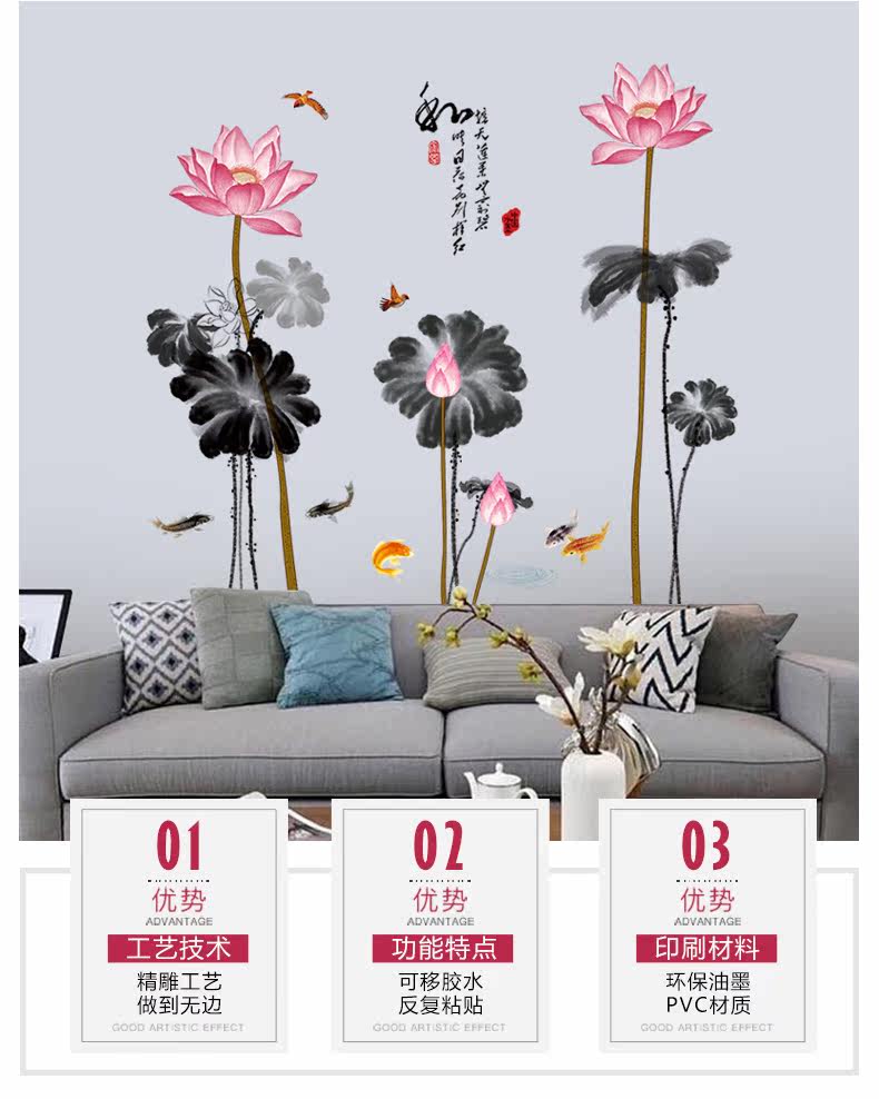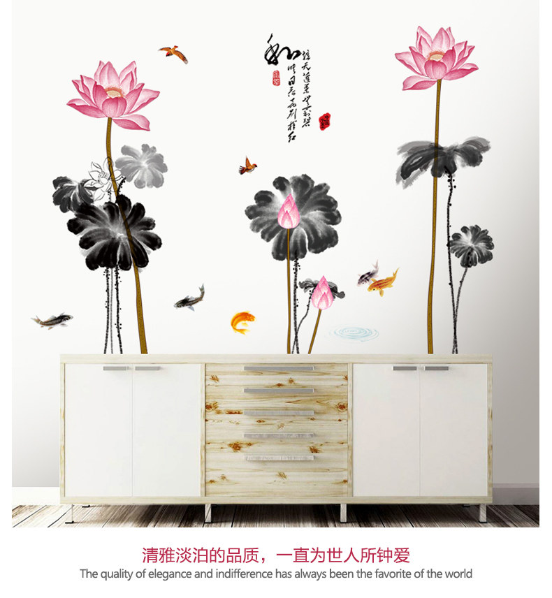 中式水墨荷花家居背景墙装饰墙贴客厅卧室温馨可移除贴画墙纸自粘
