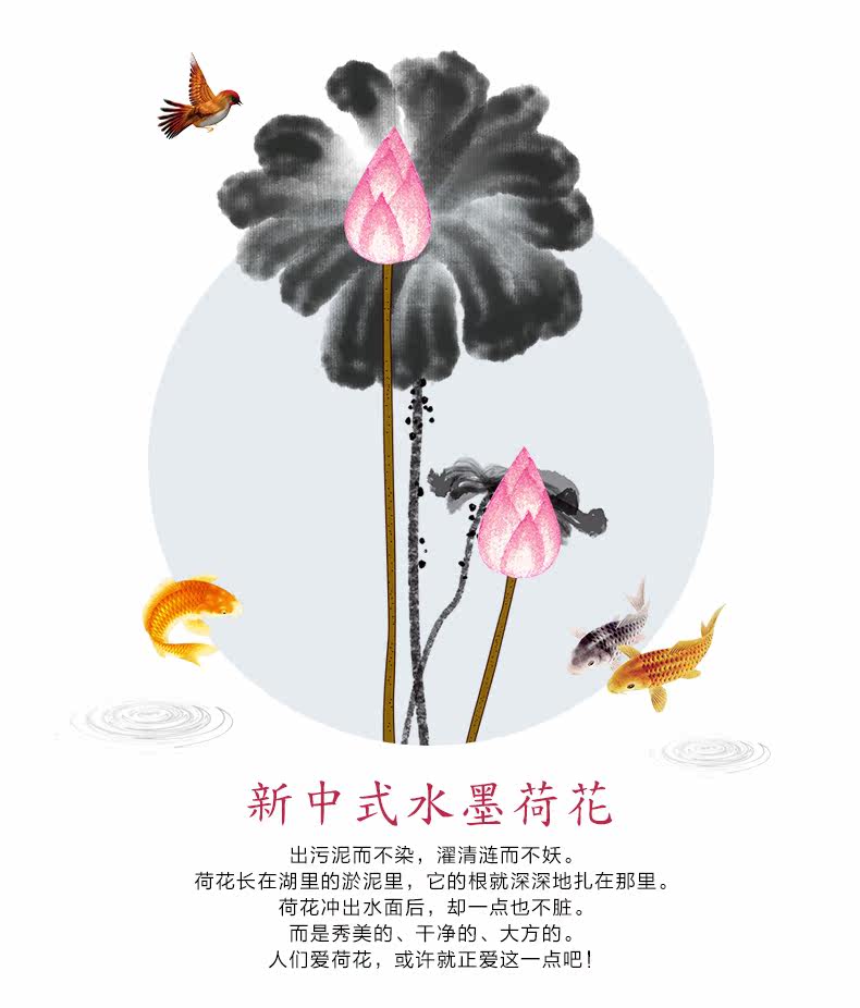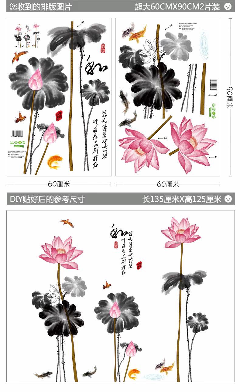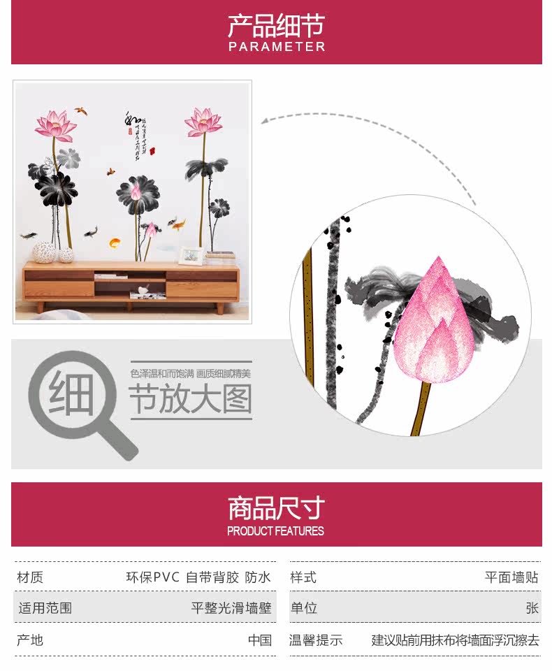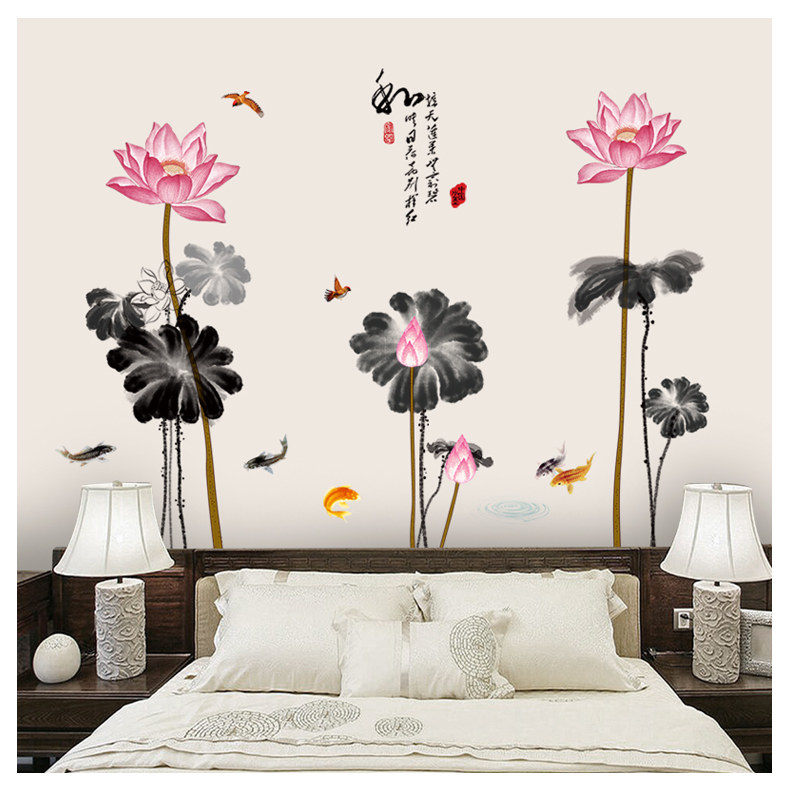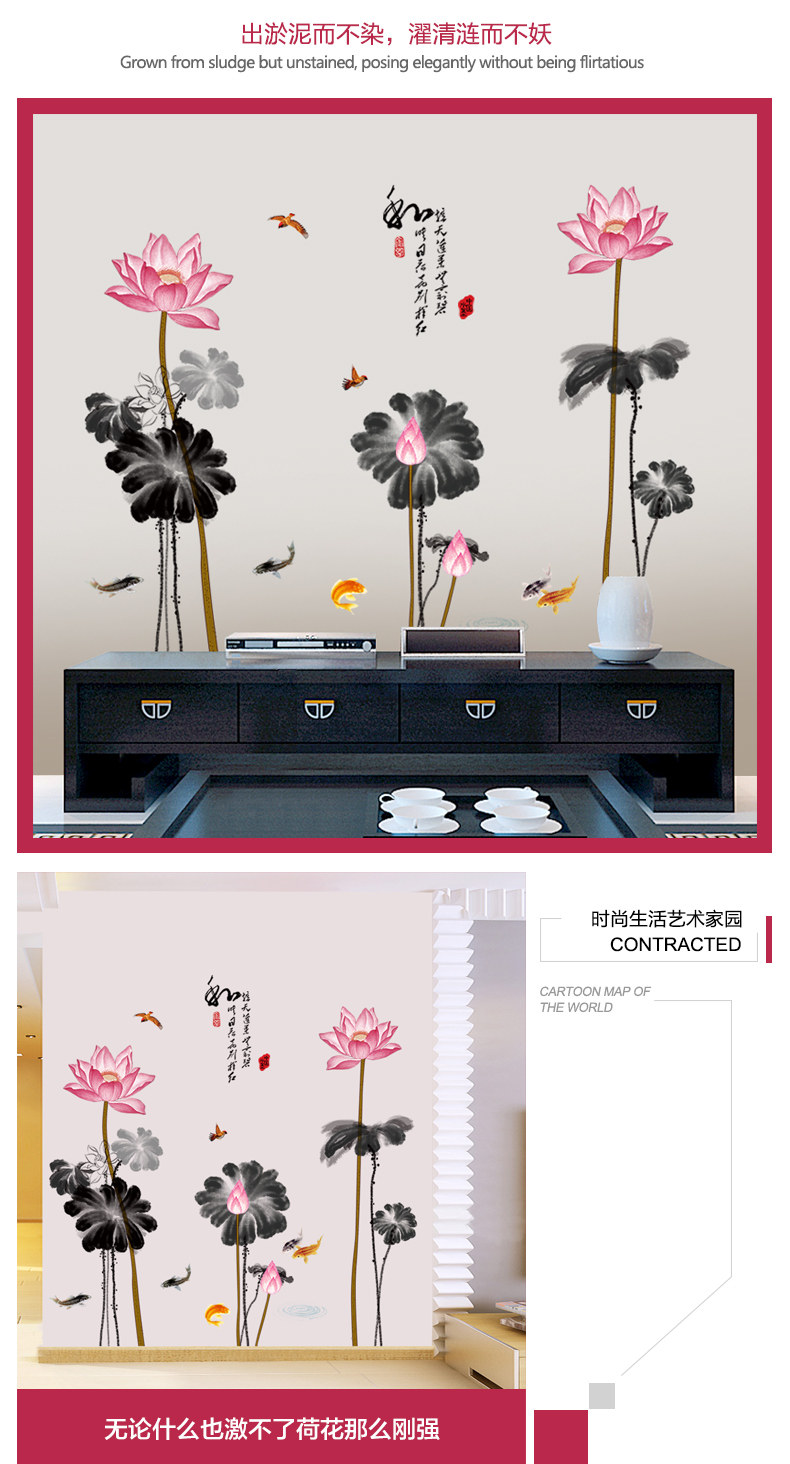中式水墨荷花家居背景墙装饰墙贴客厅卧室温馨可移除贴画墙纸自粘
