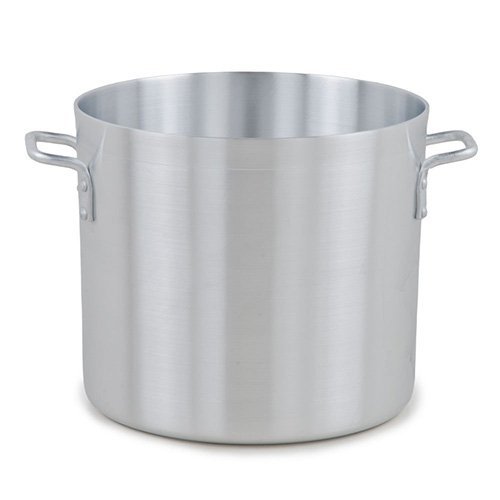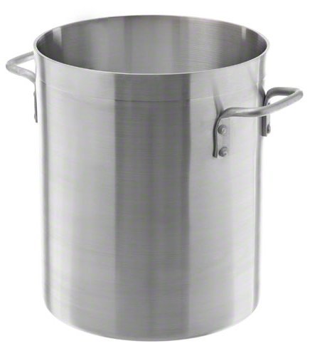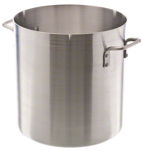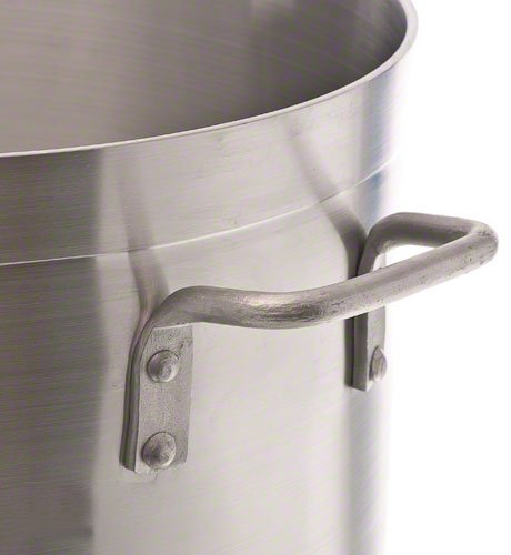 This aluminum stock pot is handiest cookware item in the kitchen. It is constructed of heavy gauge reinforced aluminum. It helps in making stock, broth and stews to braising meat or steaming lobster or crab. This can be cook nearly anything inside its wide base and high walls. Its aluminum build provides excellent heat conduction. NSF certified. Thickness is 4-mm. Measures 14-inch width by 11-7/16-inch height. Comes with 32-quart capacity.Feature