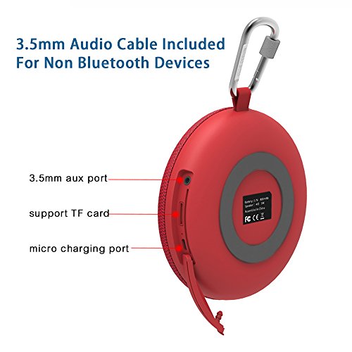 【IPX5 WATERPROOF & PORTABLE】The waterproof speakers are equipped with mini USB cables, AUX cables and carabiner. It is weatherproof, so it is ideal for trekking and hiking trips.The included hook can be attached to the backpack or the trouser buckle. Ideal for travel, hiking, camping, boating, kayaking or other activities.