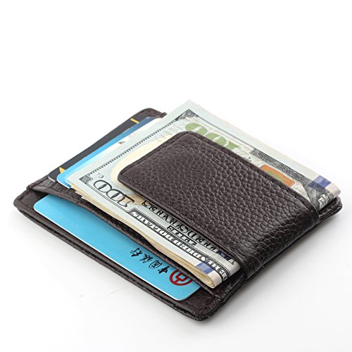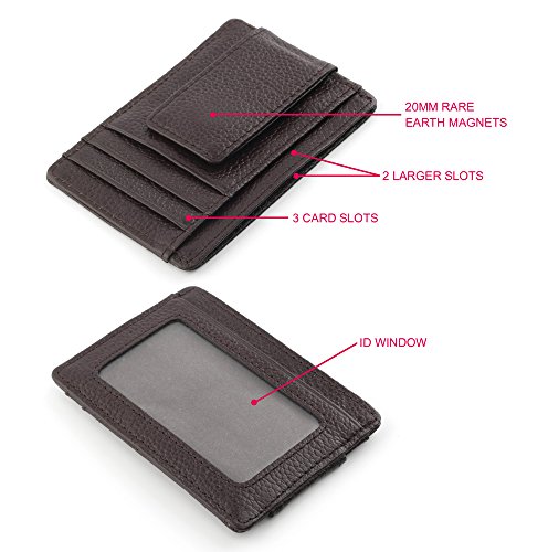 -. Feature : SIZE and FEATURES: The wallet is 4.3"x 3" and fits nicely in your front pocket. Comes with 3 card slots, 2 larger slots and an I.D. holder / RFID Blocking Wallet: Keeps your vital information in cards from being stolen. Does Block 13.56 MHz Frequency (Credit cards, debit cards, driver license and ID cards); Does NOT Block 125 KHz frequency. / Handmade and Durable: Genuine leather and high strength stitching ensure not only classy and elegant look but also scratch resistance, which means you will have a gorgeous wallet wearing well for years to come. / Powerful Magnetism: With 2pcs Strong Magnets, Can Hold Plenty of cashes and cards. / Our Guarantee: We are confident of our products.Our 12-month worry-free warranty and friendly customer service.