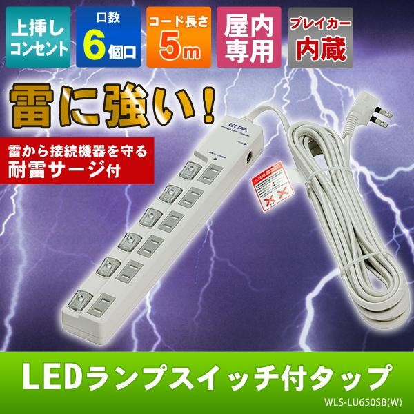 | 雷から接続機器を守る耐雷サージ付き。さらに過電流を防止するブレーカーが内蔵されています。スイッチ内部へのホコリの侵入を防ぐワイドスイッチもポイントです。スッキリ配線できるL型プラグに、コードは保護被ふく付安全構造です。 |