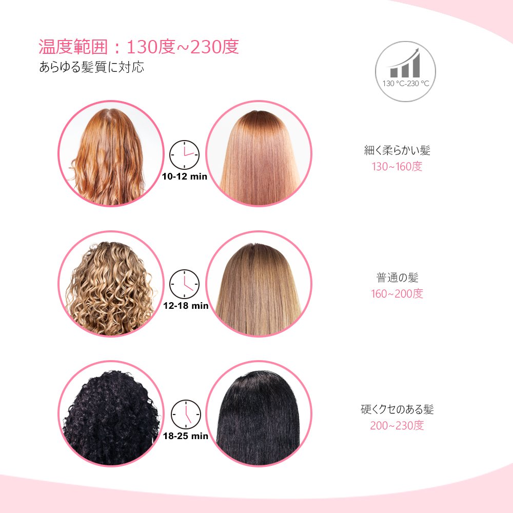 130 ° C - 230 ° C wide temperature setting to accommodate all hair quality, such as hair tight and thinner, narrow hair, people with short hair, those with damaged hair, such as those with damaged hair