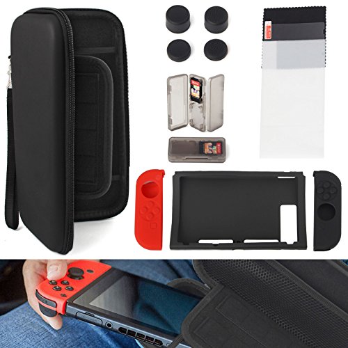 -. Feature : EVA Material***The case bag is made of EVA(ethylene-vinyl acetate copolymer).It is with a strong softness, chemical resistance and good flexibility.Protect Nintendo Switch from drops and scratches with this durable Kingtop Hard Shell Nintendo Switch Case. / For Travelling***Designed to make your new Nintendo Switch Console even more portable & travel friendly / All in one set:Internal game storage space and mesh pocket offers room to store your game cards and accessory.Including One PU Hard Shell Zip Bag,One Glass Screen Protector, One Silicone Case forNintendo Switch , Two silicone cases for Joy-Con,Two pairs silicone thumb grips caps,one cleaning cloth &2pcs Game Card Cases. / Lightweight & Compact*** Equipped with handy carrying strap,easy to carry and use. / Anti-scratch*** inner lining with soft flip insert provides extra screen protection for your new switch
