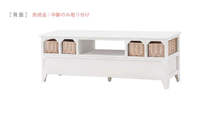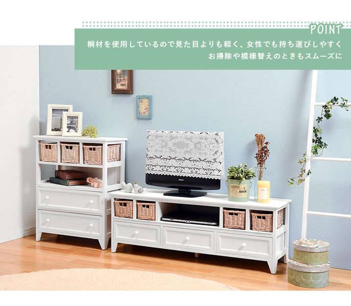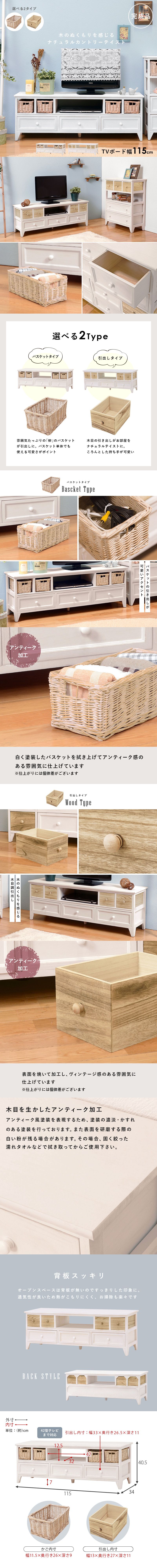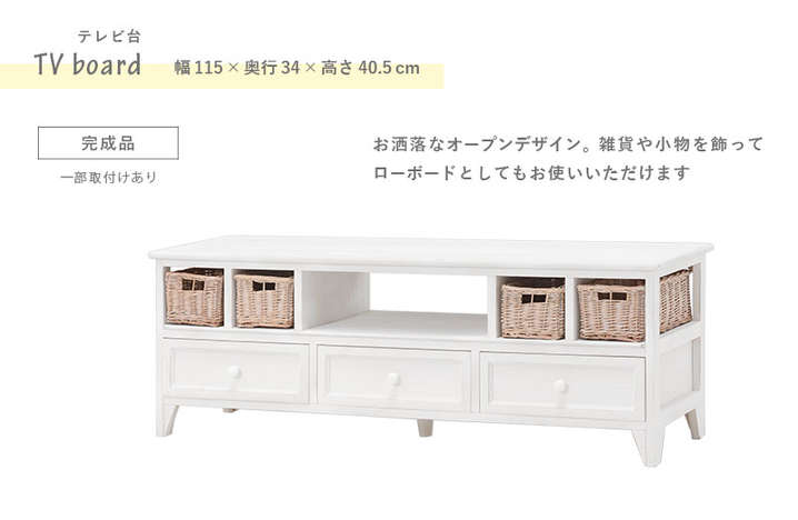 ●たっぷり収納できる、シンプルなアンティーク調テレビ台。柳のカゴがアクセント。