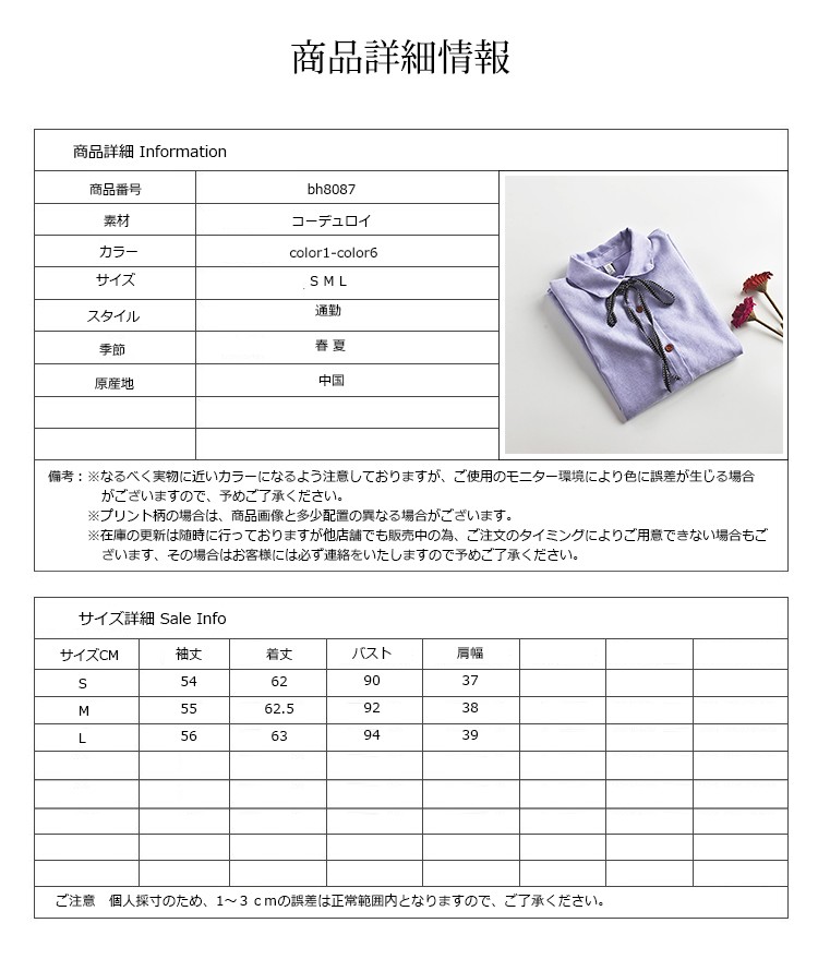 ■素材:コーデュロイ■カラー:color1-color6■サイズ:S袖丈54着丈62バスト90肩幅37M袖丈55着丈62.5バスト92肩幅38L袖丈56着丈63バスト94肩幅39■原産地:中国
