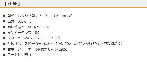 | スマートフォンやポータブル音楽プレーヤーのイヤホンジャック(φ3.5mmステレオミニプラグ)に差込むだけで使える、パッシブタイプのステレオスピーカーです。乾電池や家庭用電源が不要ですので、いつでも手軽にお使いいただけます。 |