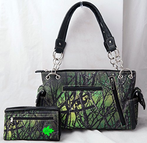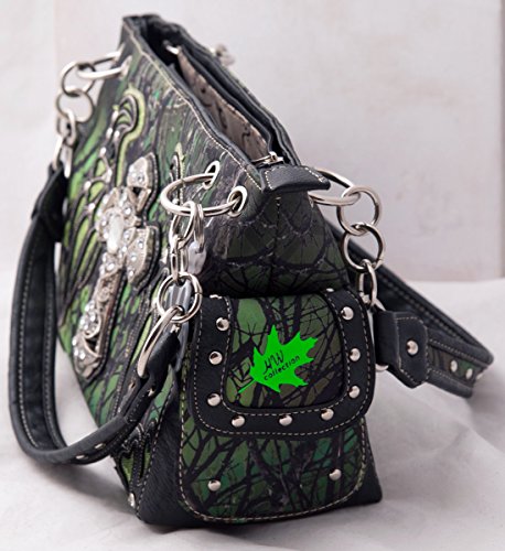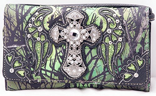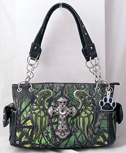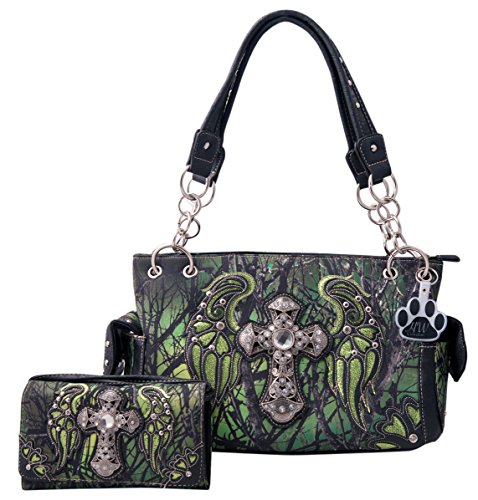 Product Description Western handbag is made from canvas and high quality premium faux/imitation leather with padded construction featuring double body wall decorated with large rhinestone cross with sequin angel wings, sequin heart trim, silvertone hardware, and detachable HW Collection key ring/purse charm on the front. Camouflage forest background around entire bag. Secure your possessions with its zip top closure. Spacious and designed to keep you organized with its single compartment fabric lined interior divided with a medium zippered pocket, front wall that has 2 open pouch pockets and a zippered wall pocket on inside rear. One secure zippered pocket on the back for a concealed carry handgun (10 inches long x 7 inches wide) and one open pocket that can fit 5 inch smartphone. Double flat chain handles. Two side pockets with colored leaf on flap that snap closed magnetically that can store your tissues, lipstick or any items you need to access quickly and easily. Metal feet on the bottom to keep the bag clean, protected and stable. Suitable for work, shopping, vacations, evenings out with friends or just to stand out and show off your western bling camo style. 13.50 inches long X 8.5 inches tall x 4.5 inches wide. Western crossbody style wallet/wristlet/clutch has a single, removable strap to convert the wallet into a wristlet and a single, long removable shoulder/crossbody strap. Snap closure. Flat currency compartments, expanding accordion area for coupons or receipts and a zippered pocket on the inside for coins. 9 slots on the inside for credit cards, ID, or business cards and 3 clear ID windows. Zippered and slide pocket on the back. 7.5 inches long X 1.5 inches wide X 4.5 inches tall. Aside from use as a wallet, it is great for occasions when you don't want to carry a big handbag and just want to bring the essentials so by using one of the straps you can be hands free! 0