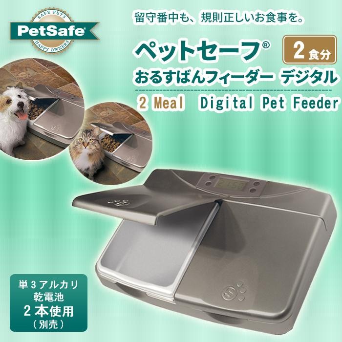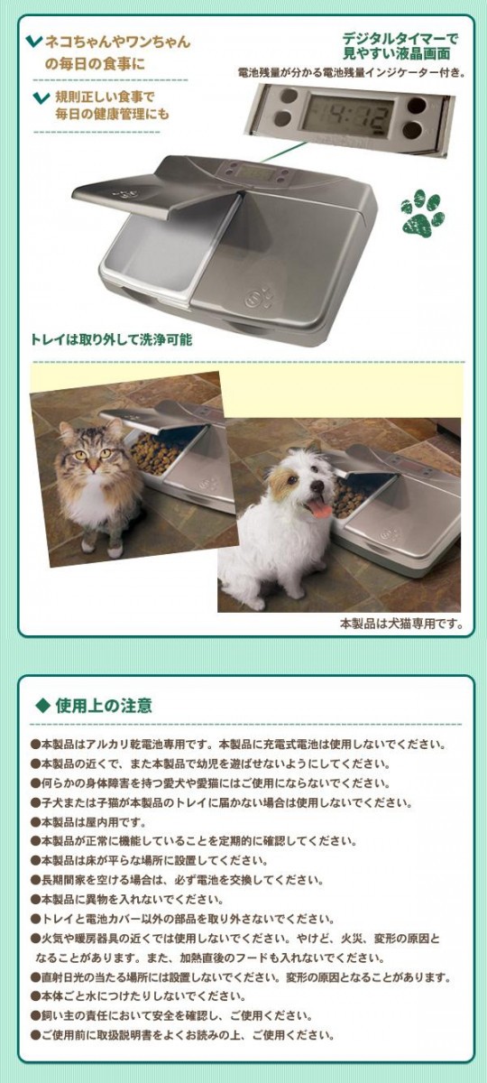 | 規則正しい時間に2食分のお食事や薬を提供することができます。2つのトレーにはドライフードが約200グラムずつ入ります。トレーは取り外して洗うことができます。デジタルタイマーなので正確な時間の設定が可能です。ご使用には単3アルカリ乾電池2本(別売)が必要です。 |