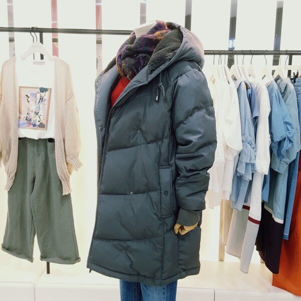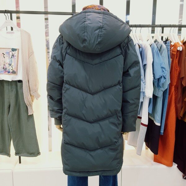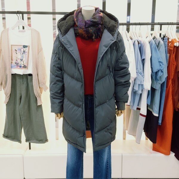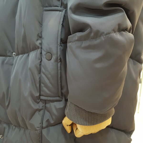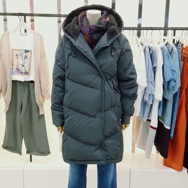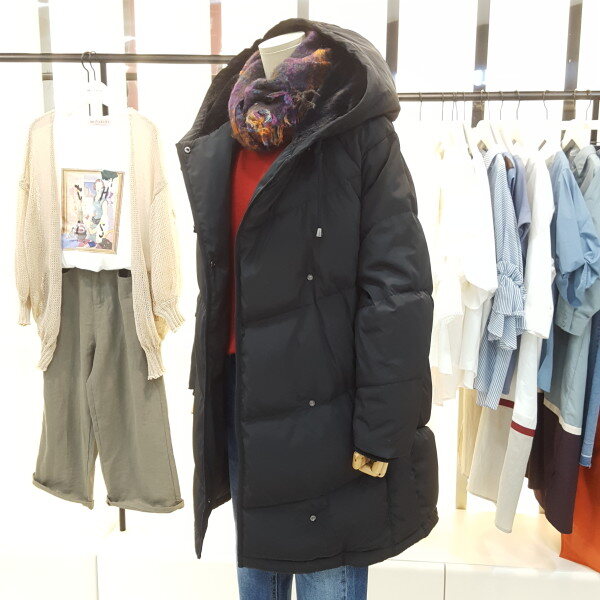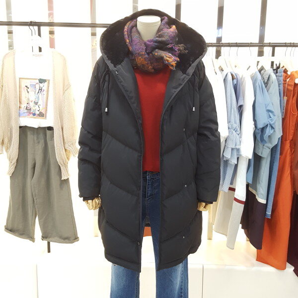 후드 모자 내부에 퍼 장식으로 겨울철 따뜻하게 착용할 수 있는 오리털 패딩입니다.오리털 충전재를 사용하여 가벼운 착용감과 우수한 보온성의 제품입니다.