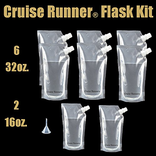 -. Feature : REUSABLE: The Cruise Runners are washable. Use for many activities. / * KEEPING IT SIMPLE AND SMART: When you purchase our Cruise Runner Flask Kit you will receive 8 total flasks, 6 32oz and 2 16oz. Runners. Keep 32 oz in your Stateroom and fill the 16 oz. Runners to enjoy off-shore at the beach, jacuzzi or Night Club. The 16 oz. runners slip, completely undetectable in the pocket of your shorts, pants, jacket or purse!. When empty simply refill from your stateroom stash! SAVE HUNDREDS ON YOUR CRUISE! A mini funnel is included for spill-free filling. / * PACKING: The Cruise Runners store, completely undectable in your checked luggage. Packing instructions included. Non detectable by x-ray or metal detectors.enjoy Rum Runners, Margarita's Etc. from the comfort of your Stateroom or Balcony. / *NOT JUST FOR CRUISES: The flasks are perfect to transport any beverage anywhere. Camping, Fishing, Golf Course, Football Games, Hockey Games, Baseball Games,Basketball Games,Tennis, Concerts, Picnics / *HIGH QUALITY: Food grade plastic, freezable, odor proof, leak proof, puncture resistant and it also floats! Better value than the rum runner cruise kit.