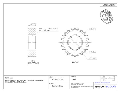 Boston Gear GA24 Plain Change Gear, 14.5 Degree Pressure Angle, 20 Pitch, 0.625" Bore, 24 Teeth, Steel