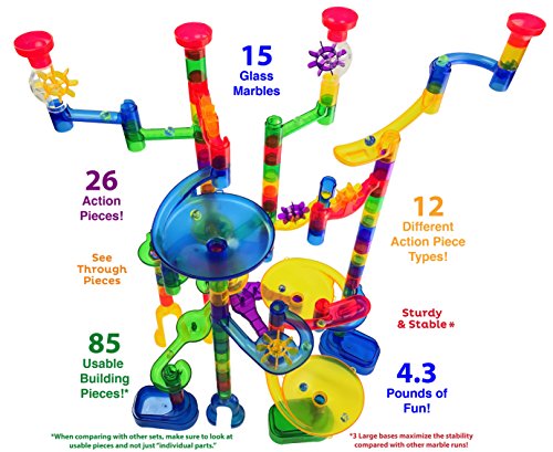 This vibrant Marble Run comes with 85 translucent pieces that allow you to see the marble action from top to bottom as the 15 glass marbles make their way down the set. The solid plastic pieces allow for easy use by young kids and adults. Marble Runs allow for almost infinite possibilities for assembly from the very simple to the extremely complex. This Marble Run Super Set is the perfect way to allow you to start discovering the endless possibilities and excitement that comes from designing a run and watching the marbles make their way down the set.Feature