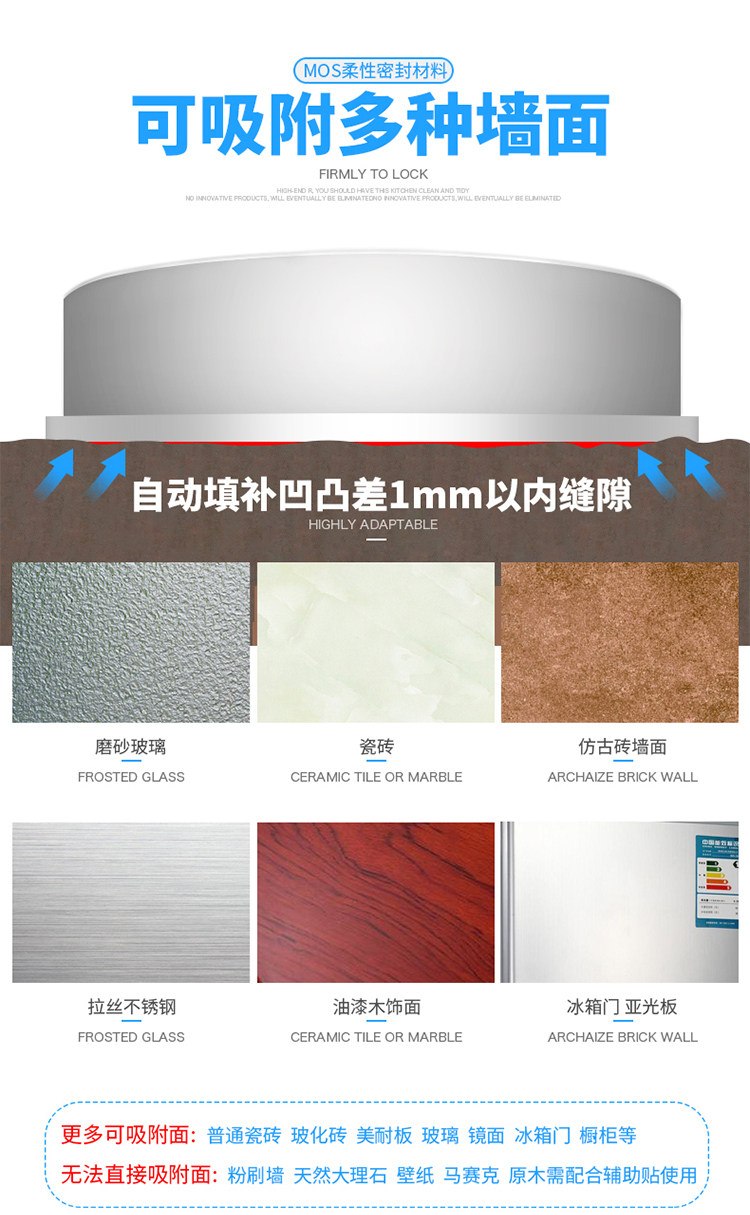 ①粉刷墙/乳胶漆/白墙;②墙纸;③未上漆的木头及其他透气材质。(若要使用,需购买专用辅助贴片【点击进入】)