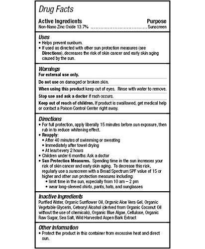 Facial Moisturizer for ALL Skin Types. We use high quality ingredients. NO harmful chemicals or preservatives. Hypoallergenic. No animal testing. We have worked for 10 years to refine our formulas. Goes on smooth and absorbs well, helping hold in moisture. It works to reduce lines, wrinkles and helps repair damaged skin. Ingredients: Active Ingredient: Uncoated Non-Nano Zinc Oxide - 13.7%, Purified Water, Organic Sunflower Oil, Organic Aloe Vera Gel, Organic Vegetable Glycerin, Cetearyl Alcohol (derived from Organic Coconut Oil without the use of chemicals), Organic Lavender Oil, Organic Lemon Oil, Organic Blue Green Algae, Cellulose, Organic Raw Sugar, Sea Salt, Wild Harvested Aspen Bark Extract Directions: Apply each morning to face, neck and hands, before putting on make-up. For full protection, apply liberally to all exposed skin before sun exposure, then rub in until sunscreen is no longer visible. Reapply after swimming, sweating or towel drying. Warnings: For external use only. Stop use and ask a doctor if skin rash occurs or persists. Rinse with water if sunscreen gets in your eyes. Decrease UV exposure by limiting time in the sun, wearing protective clothing, and using sunscreen.Feature