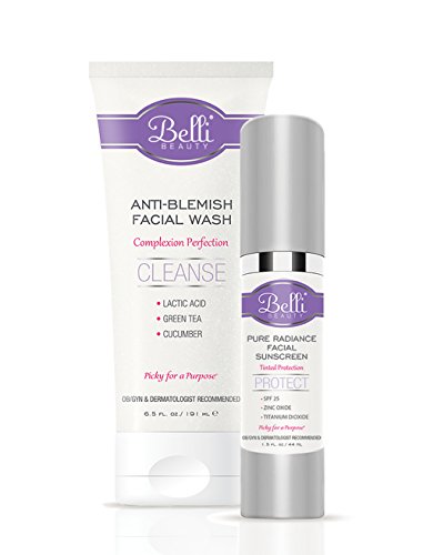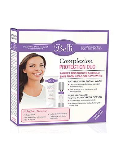 Belli Complexion Protection Duo combines 2 essentials for facial skincare, Anti-Blemish Facial Wash with lactic acid to gently and effectively cleanse and exfoliate acne prone skin and Pure Radiance Facial Sunscreen SPF 25 with mineral sunscreens, titanium dioxide and zinc oxide, for broad spectrum protection. All ingredients in Belli products are selected based upon extensive reviews of published medical studies. OB/GYN and dermatologist recommended, our products are allergy tested, and are free of artificial dyes, fragrances, phthalates, and paraben preservatives. At Belli, we follow a unique safety screening process to avoid ingredients with known links to birth defects, miscarriages, and harmful effects while breastfeeding. Picky for a purpose, all of our products are gluten-free and are not tested on animals. Upgrade your skincare routine for beautiful skin and peace of mind today!