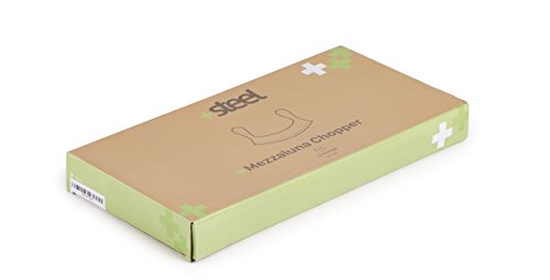 The Mezzaluna Chopper is made from all stainless steel and is 12 inches long. Hand washing recommended.