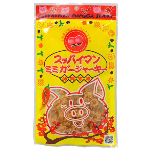 | ミミガー(豚耳皮)には、良質のたんぱく質が豊富に含まれており、沖縄では昔からミミガーを酢の物として、こりこりとした歯ごたえを楽しんでいました。そのミミガーに(株)上間菓子店さんのスッパイマン特製梅エキスで味付けした共同開発商品です。ピリッと赤唐辛子の辛味と、噛めば噛むほど梅味の出るおいしいおつまみです。ビールのおつまみやおやつにぴったりの乾燥肉です。沖縄の観光土産としても大変喜ばれる一品です。 |