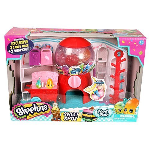 -. Binding : Toy -. Brand : Shopkins -. EAN : 0630996561652 -. Feature : Load your gumballs into the gumball machine, turn the dial and let them roll / Display your favorite Shopkinson a lollipop tree. Take your Shopkins for a ride in the candy cart / So much sweet fun and heaps of ways to display. This is one dandy candy play set! -. IsAdultProduct : 0 -. Label : Moose Toys -. LegalDisclaimer : must be over 18 years of age to purchase -. Manufacturer : Moose Toys -. Model : 56165 -. MPN : 56165 -. NumberOfItems : 1 -. PackageQuantity : 1 -. PartNumber : 56165 -. ProductGroup : Toy -. ProductTypeName : TOYS_AND_GAMES -. Publisher : Moose Toys -. Studio : Moose Toys -. Title : Shopkins Sweet Spot Playset -. UPC : 792158230384 -. Warranty : No Warranty