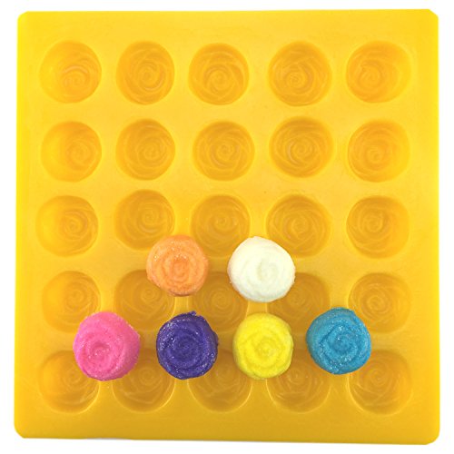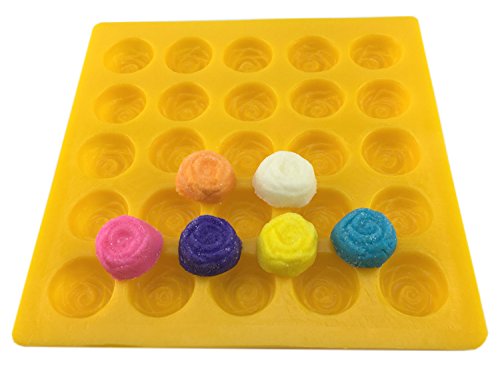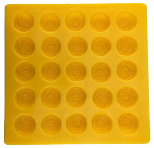 - Rose Soft Candy Mold: 25 Cavities per mold, 1 Design, Mold Size: 7 ⅜” x 7 ¼”, Cavity Size: 1” Diameter x ⅝” Depth