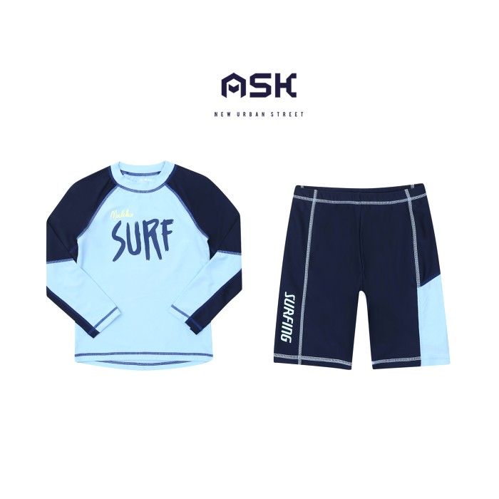 칼라배색이 포인트인 래시가드와 5부팬츠로,