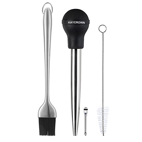 ★High quality Food grade basting brush with a 12" extra long stainless steel handle for avoiding burnt hands. ★ Rubber bulb: the reason that most basters lose suction is due to the quality of the bulb material, with the high quality BPA-Free Rubber materials and perfect design ensures maximum suction at all times, even when basting heavy juices and liquids. Strong, durable and will not melt or crack even at high temperatures, is comfortable to hold and squeeze at any angle. ★ Professional Kitchen Quality Sturdy Stainless Steel Design: 100% Food Grade Stainless Steel main body, it is more hygienic and safer than the plastic baster. ★ Injector Needle and Cleaning Brush Included: More effective and utility with BestUtensils baster set. ★ Can Be Used On Any Meat To Infuse Mouthwatering Flavors: ideal For Briskets, Poultry, Smoked Meats, Ground Beef, Bacon, BBQ's and Cookouts. Ensuring meat is moist throughout cooking is the simplest way to ensure delicious meals. ★ It is perfect for getting the Thanksgiving Turkey just right with this baster set. ★ One-year guarantee for noncommercial use. ★ All Parts Dishwasher Safe. 0