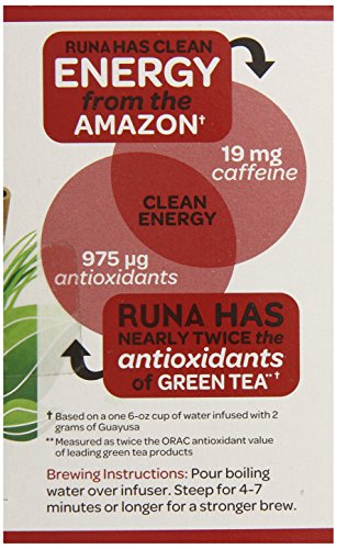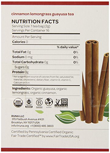 Studio : Runa LLC Publisher : Runa LLC Binding : Grocery Product Description Runa ? Cinnamon Lemongrass Guayusa ? 16 Infusers Guayusa (why-you-sa) is an Amazonian super-leaf naturally packed with caffeine and antioxidants. It gives you the clean, focused energy you need to do the things you love. Guayusa lacks the bitter tannins that traditional teas have, so it is naturally smooth and sweet. Runa’s guayusa is certified organic, Fair Trade, non-GMO, and Kosher. An effortless blend of rich guayusa and spicy cinnamon with a hint of aromatic lemongrass. 0