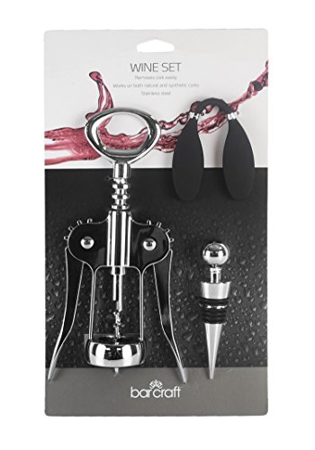 Studio : Bar Craft Publisher : Bar Craft Binding : Kitchen Product Description Perfect for all wine enthusiast, this Barcraft 3-Piece Essential Wine Gift Set with Winged Corkscrew Bottle Opener has everything you need to enjoy a bottle of wine. The sturdy wine bottle opener feels substantial in the hand and looks elegant on the table. Wine connoisseurs find it foolproof and efficient - simply place the wine corkscrew opener over the bottle, twist the handle to insert the auger into the cork, and watch the opener's wings rise. Then press the wings down to extract the cork. A coated wire screw glides smoothly through the cork, and a stopper prevents the screw from breaking the cork. The bottle stopper features a modern design that provides air-tight seal for any standard size wine bottle, keeps your wine fresh for longer (also works with similar size oil, vinegar and liquor bottles). Ultra-stylish ball top with chrome finish, attractive modern style that adds sophistication to your kitchen and parties; rubber ring seals out air, preserves contents longer. The decorative wine bottle stopper also prevents spills and kitchen accidents. Simple to use, rubber rings ensure a snug fit for best performance. The foil cutter is ergonomically designed for ease and comfort, your wine bottle foil top will be perfectly removed with just a quick and easy quarter turn of the wrist. Easy for all adults, even those with wrist and arthritis issues. 0