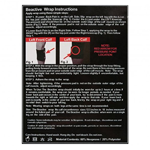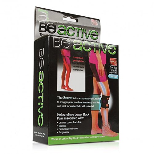 -. Binding : Health and Beauty -. Brand : Natures Pillows -. Color : Black -. EAN : 7671314241736 -. Feature : The patented pressure pad in the brace applies targeted pressure to the specifc point that provides back pain relief! BeActive is now FDA approved for Class 1 Medical Devices! / Helps relieve lower back pain associated with Sciatica! / Quick and easy to apply . The Beactive wrap should initially be worn for up to 2 hours at a time. If it remains comfortable, the wrap can be worn for longer periods as needed. / Works on either right or left leg! The Beactive wrap fits the calf circumference sizes 12.5 inches to 18 inches measured around the fullest part of the calf. The Beactive wrap is effective when worn on a single leg on the side of the pain. / Discreet and easily hidden under clothing. -. IsAdultProduct : 0 -. IsAutographed : 0 -. IsMemorabilia : 0 -. Label : Nature's Pillows -. LegalDisclaimer : REVOLUTIONARY DISCOVERY: The patented pressure pad in the brace applies targeted pressure to the specific point that provides back pain relief -. Manufacturer : Nature's Pillows -. Model : NP-BA1000 -. MPN : NP-BA1000 -. NumberOfItems : 1 -. PackageQuantity : 1 -. PartNumber : NP-BA1000 -. ProductGroup : Health and Beauty -. ProductTypeName : HEALTH_PERSONAL_CARE -. Publisher : Nature's Pillows -. ReleaseDate : 2014-10-30 -. Studio : Nature's Pillows -. Title : BeActive Knee Brace: Helps Relieve Lower Back Pain and Pain from Sciatica, One Size Fits All -. UPC : 893621002443